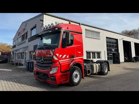 Abgasnorm EURO 6, Achskonfiguration: 4x2, Actros 4, Anhängersteckdose 24V / 15-polig, Arbeitsscheinwerfer, Auspuff nach rechts außen, Außenspiegel elektr. verstell- und heizbar, Differentialsperre Hinterachse, Drucklufteinheit mittel, Fahrassistenz-System: Attention-Assist (Müdigkeitserkennungs-Sensor), Fahrassistenz-System: Bremsassistent (Active Brake-Assist), Fahrassistenz-System: Spurhalteassistent, Fahrerhaus: Breite 2,30 m, Fahrerhaus: L StreamSpace, Fahrerhaus: stahlgefedert, Komfort, Fahrerhausboden mit Motortunnel 170 mm, Federung: Blatt / Luft, Federung: Vorderfederbock Aluminium, Fensterheber elektrisch, Generator 100 A, Harnstofftank (AdBlue): 60 Ltr., Karosserie/Aufbau: Sattelzugmaschine, Komfortliege unten, Komfortschließanlage, Kommunikationsschnittstelle, Kotflügel 3-teilig, Kühlerjalousie, Lenkhelfpumpe geregelt, Luftpresser 2-stufig, Motor 12,8 Ltr. - 330 kW R6 Diesel (OM 471), Motorraum-Kapselung, Rampenspiegel, Restwärmeausnutzung, Scheibenbremsen Vorder- und Hinterachse, Sitzbezug / Polsterung: Stoff, Sitze im Fahrerhaus: Beifahrerfunktionssitz, Sitze im Fahrerhaus: Fahrersitzlehne umklappbar, Spannungswandler 24V / 12V 10 A, Spritzschutz vorn, Stabilisator Vorderachse, Stauklappe außen links, Steckdose Fahrerhaus 24V, Tachograph / EG-Kontrollgerät, Türverlängerung für Fahrerhaus, Unterbodenverkleidung aerodynamisch geformt, Unterfahrschutz vorn, Vorbereitung CB-Funk, Vorbereitung Mauterfassung, Vorderachse gekröpft, Wasserpumpe geregelt, Zul. Gesamtgewicht 18,00 t, Zusatzheizung (Wasser)